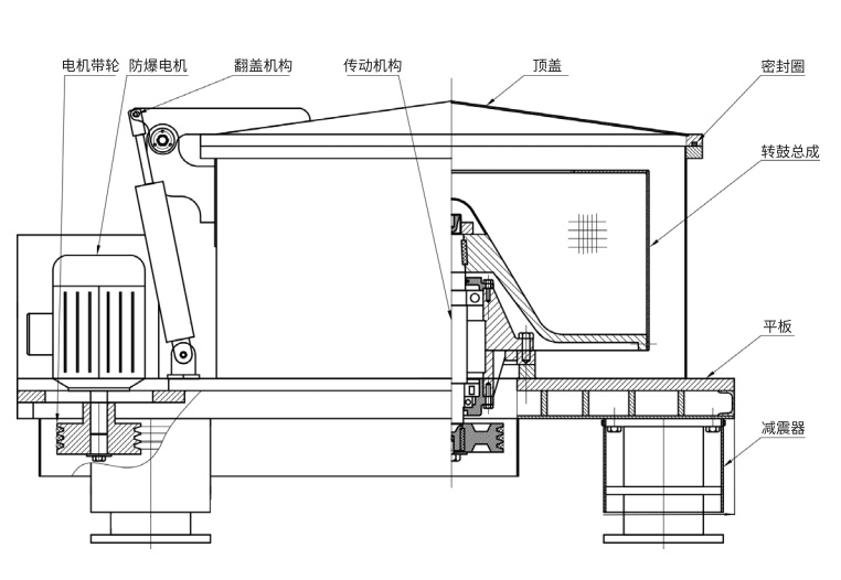 8.PSF型离心机采用直联防爆电机,消除了带传动带来的磨擦粉尘;同时由于电机安装于机器底部,离心机占地面积更小。