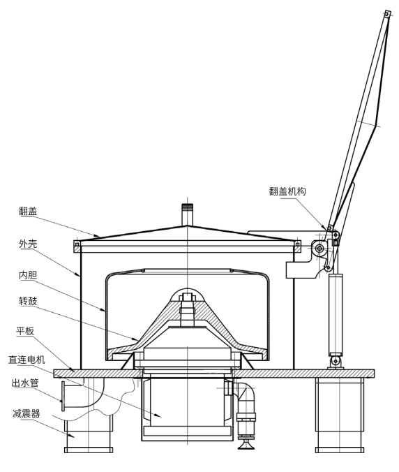 4.翻盖设置进料管、洗涤管、观察镜、照明孔。配置在线清洗系统(选装),对离心机外壳内壁、转鼓内外表面、集液槽表面等离心机内部不可见部位进行清洗,符合GMP规范。.
