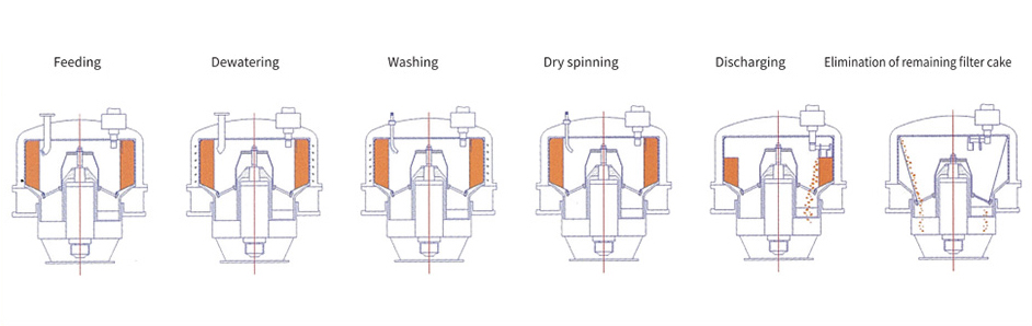 Material to be separated enters into the basket of the centrifuge that is rotating at high speed through a feeding pipe, and under action of the centrifugal field, the material passes through the filter cloth (screen) for filtration. Then the liquid phase discharges through the discharge pipeline, while the solid phase is retained in the basket. Feeding stops once the basket is filled with the material, then wash the solid cake, and discharge the washing liquid through filtration. The centrifuge continues to rotate to spin - dry the solid cake. After the solid cake meets the requirements for separation, the centrifuge reduces its speed, and removes the cake by means of the scraper, then discharges the cake out of the centrifuge. The centrifuge further reduces its speed So that the pneumatic pulling bag device moves reciprocally to shake off the residual solid cake, thus completely eliminating the solid cake.