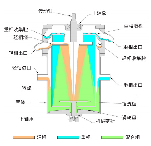 The mixed liquid enters the drum under the action of the vortex disc or feeder. In the cavity area formed by the web, the mixed liquid quickly rotates synchronously with the drum. Under the action of centrifugal force, the heavy phase liquid gradually moves away from the center of the drum and towards the drum wall in the upward flow process; The light phase liquid with small specific gravity gradually moves away from the drum wall and towards the center. The clarified two-phase liquid finally enters the collection chamber through their respective weir plates and is led out of the machine by the lead pipe to complete the two-phase separation process.