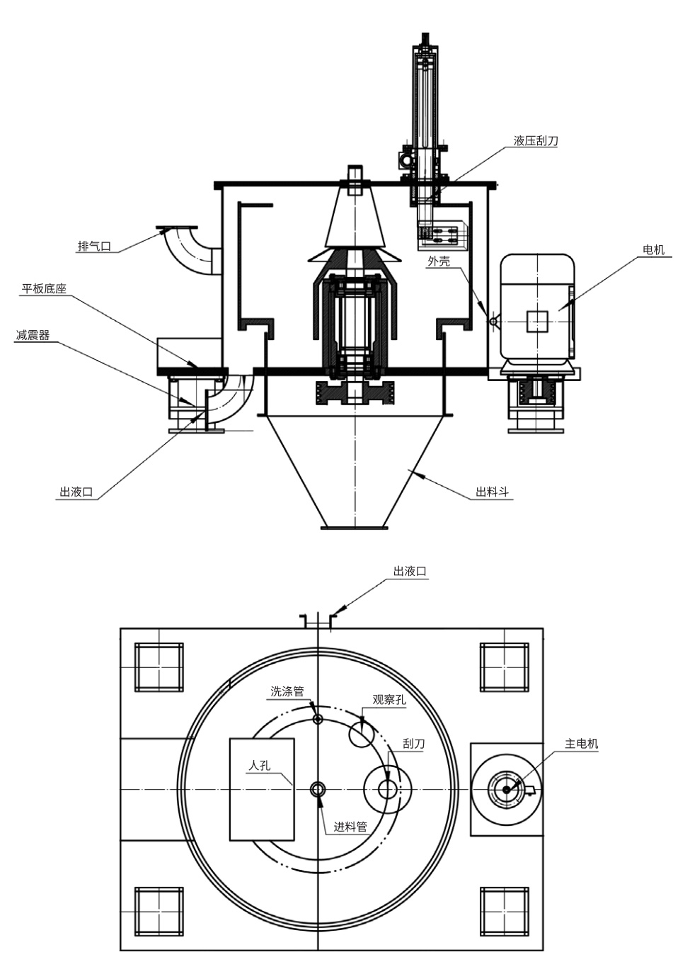 The automatic bottom discharge scraper centrifuge is vertical fully - automatic filtration centrifuge. The motor drives the basket to rotate at high speed through the belt, and under the control of pre - written program, the material to be separated is fed into the basket through the feed system. After the material is filtered through the filtration medium (filter cloth/screen) under the action of centrifugal force, the liquid phase discharges out of the centrifuge through the liquid pipeline, and the solid phase is retained in the basket. A material detection device is used to detected material flling position in real-time manner, and when the solid cake deposited in the basket reaches the specitfied holding capacity of the centrifuge, feeding stops. Then wash and dry the solid cake. After the solid cake meets requirements for knock-out, the centrifuge reduces to the scraping rate, under the hydraulic (pneumatic) control, the scraper device removes the solid cake, and then the cake is discharged at bottom outlet of the centrifuge.