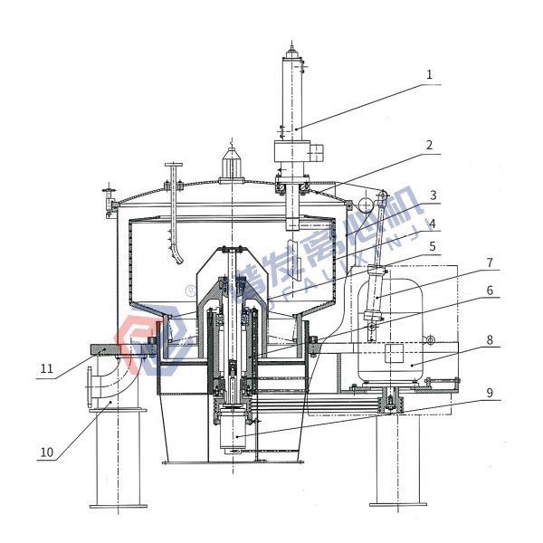 Material to be separated enters into the basket of the centrifuge that is rotating at high speed through a feeding pipe, and under action of the centrifugal field, the material passes through the filter cloth (screen) for filtration. Then the liquid phase discharges through the discharge pipeline, while the solid phase is retained in the basket. Feeding stops once the basket is filled with the material, then wash the solid cake, and discharge the washing liquid through filtration. The centrifuge continues to rotate to spin - dry the solid cake. After the solid cake meets the requirements for separation, the centrifuge reduces its speed, and removes the cake by means of the scraper, then discharges the cake out of the centrifuge. The centrifuge further reduces its speed So that the pneumatic pulling bag device moves reciprocally to shake off the residual solid cake, thus completely eliminating the solid cake.