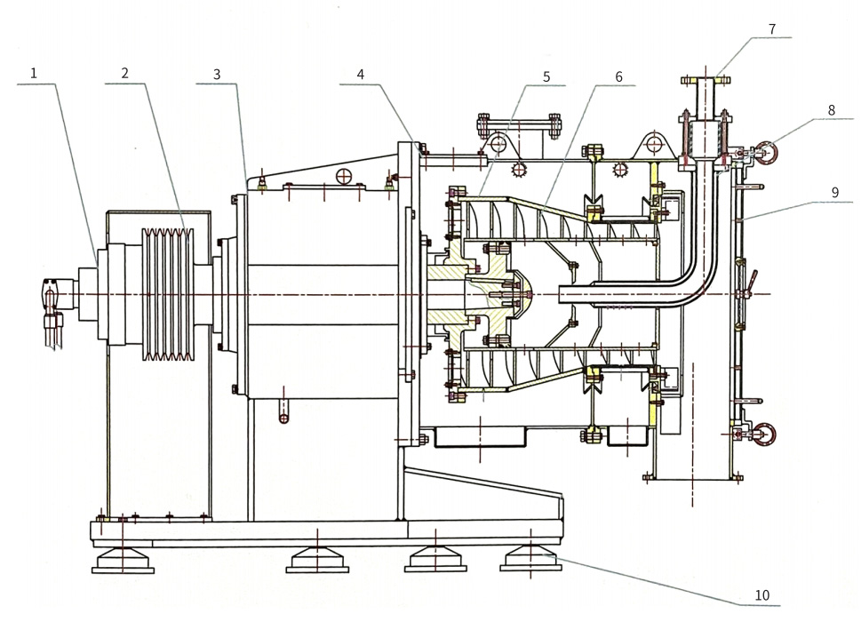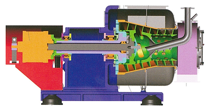 LSWG series centrifuge is a kind of solid-liquid separating equipment. The suspension will be fed, dehydrated, washed and discharged continuously under full speed. During the operation of the centrifuge, when power on, the centrifuge will start and accelerate automatically. When reaching the preset speed, the feeding valve will open, the suspension will enter into the decanter section of the centrifuge through the feeding pipe and the distributing cone at the middle section of the spiral. The suspension with low solid content will be pre-dehydrated and thickened So as to ensure the clarification in the decanter section.