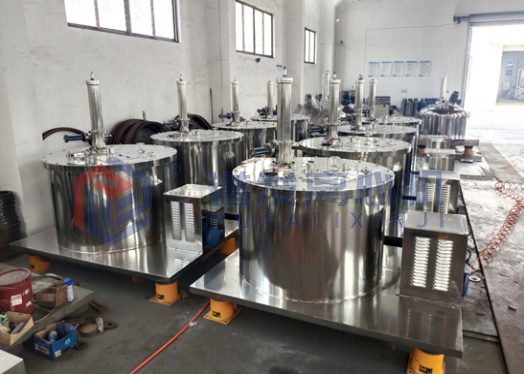 The automatic bottom discharge scraper centrifuge is vertical fully - automatic filtration centrifuge. The motor drives the basket to rotate at high speed through the belt, and under the control of pre - written program, the material to be separated is fed into the basket through the feed system. After the material is filtered through the filtration medium (filter cloth/screen) under the action of centrifugal force, the liquid phase discharges out of the centrifuge through the liquid pipeline, and the solid phase is retained in the basket. A material detection device is used to detected material flling position in real-time manner, and when the solid cake deposited in the basket reaches the specitfied holding capacity of the centrifuge, feeding stops. Then wash and dry the solid cake. After the solid cake meets requirements for knock-out, the centrifuge reduces to the scraping rate, under the hydraulic (pneumatic) control, the scraper device removes the solid cake, and then the cake is discharged at bottom outlet of the centrifuge.