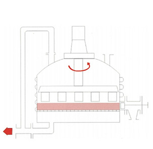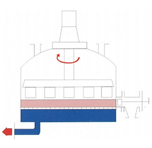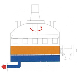 图7:最后,经过搅拌器在卸料方向的旋转和同时的下降运动,搅拌器刮铲一层一层地顺序将滤饼刮出,滤饼可从卸料口自动出料。