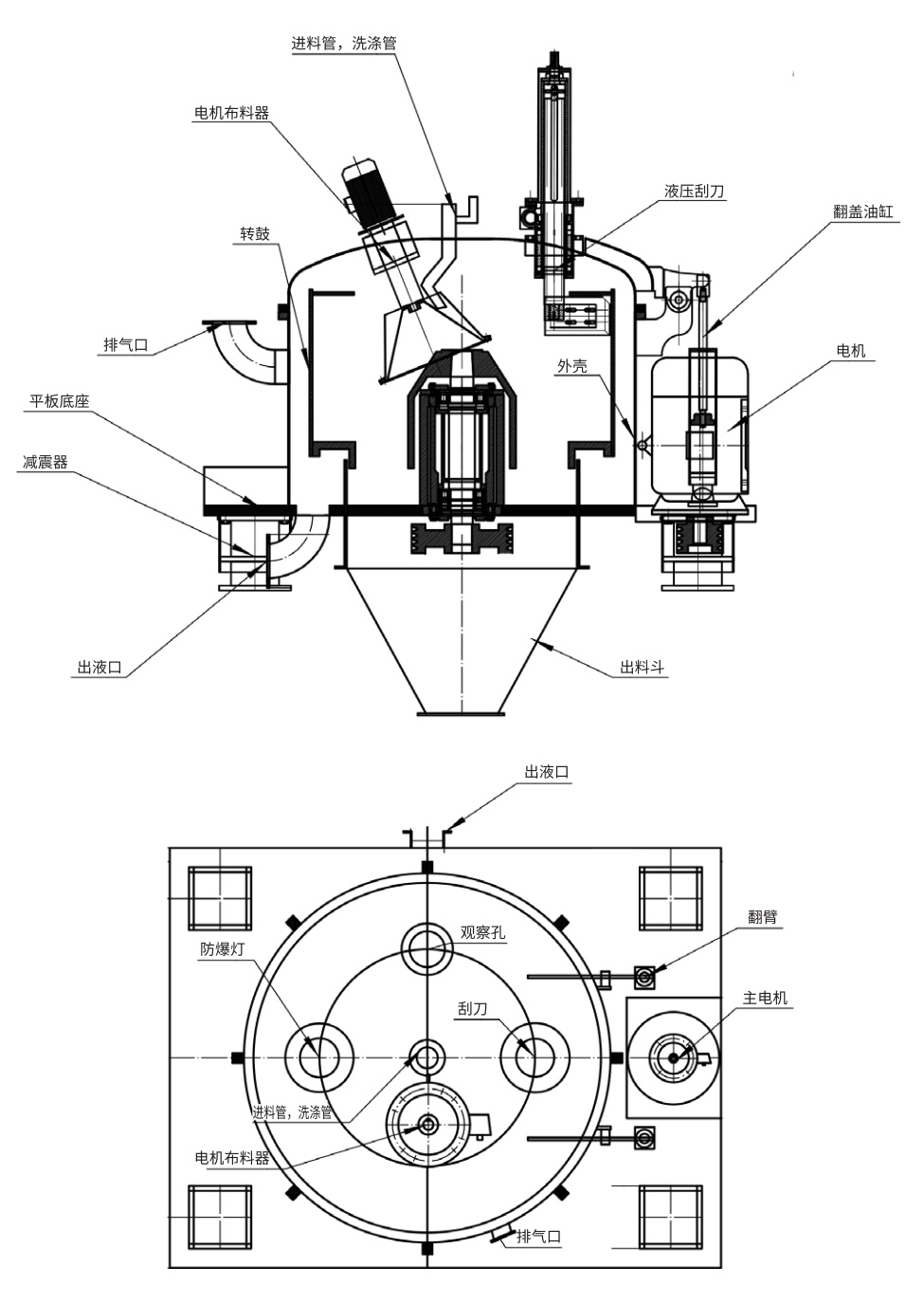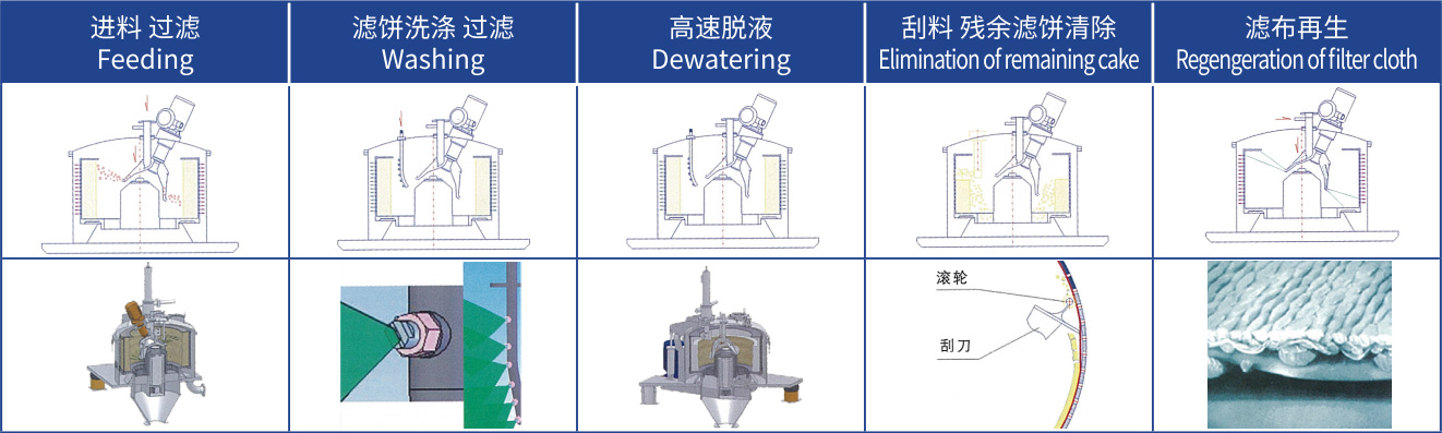 刮刀下部卸料离心机为立式全自动过滤离心机。电机通过皮带驱动转鼓高速旋转,待分离的物料在预先编制的程序控制下,通过进料系统进入高速旋转的离心机转鼓内。在离心力场的作用下,物料通过过滤介质(滤布/滤网)的过滤,液相经出液管排出机外,固相则被截留在转鼓内。物料检测装置实时检测物料充填位置,当转鼓内滤饼达到机器规定的装料量时,停止进料。然后对滤饼进行洗涤、甩干。滤饼达到脱液要求后,离心机降低到刮料速度,刮刀装置在液(气)动控制下将滤饼刮下,并经离心机下部的出料口排出。