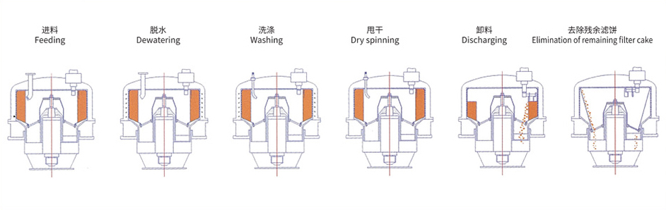 待分离的物料经进料管加入高速旋转的离心机转鼓内,在离心场的作用下,物料经滤布实现过滤,液相经出液管排出,固相则被截留在转鼓内。当物料被加满时,停止进料,对滤饼进行洗涤,同时将洗涤液滤出。离心机继续旋转,对滤饼进行甩干。滤饼达到分离要求后,离心机降速,通过刮刀将滤饼刮下从底部排出机外。离心机再降速,气动拉袋装置上下往复运动,将残余滤饼抖落,实现滤饼的完全清除。