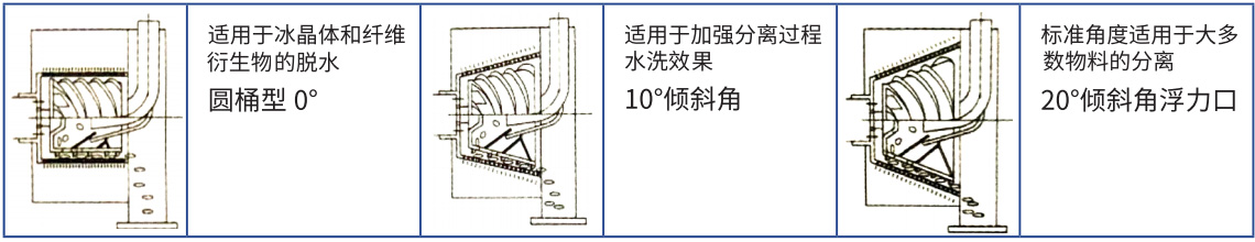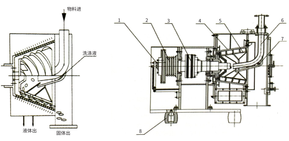 LWG系列螺旋/筛网离心机可以是圆桶形或圆锥形,具有不同角度的螺旋确定出料速度及滤饼在筛网上滞留时间,该角度由生产厂家根据工艺要求来确定。